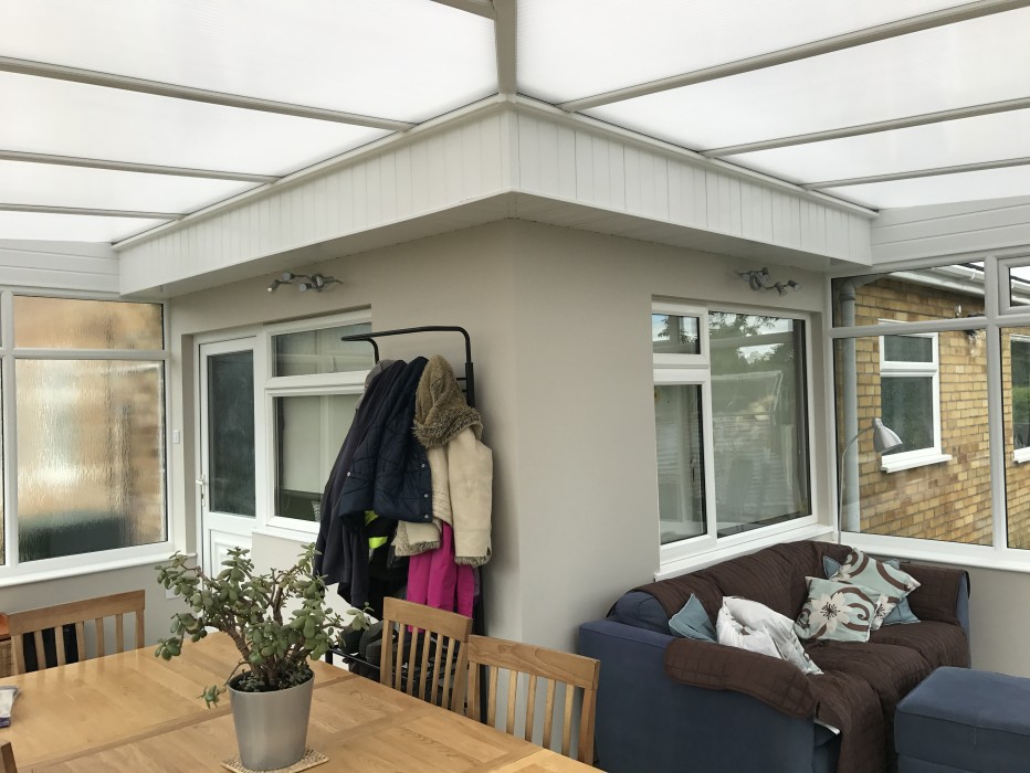 Large wrap around corner conservatory with box gutters against a detached bungalow